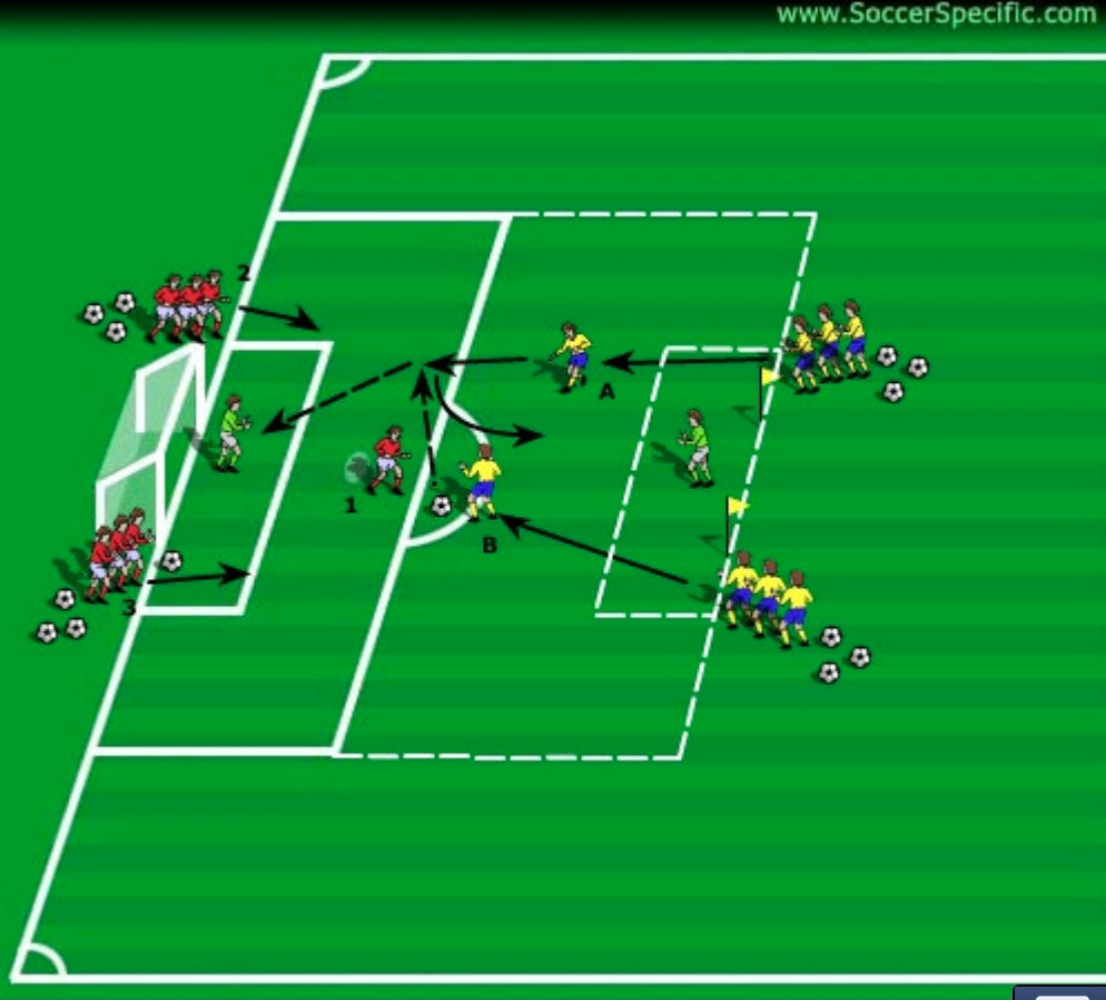 Position two goals 36 yards apart (two penalty boxes on top of each other). Squad is split into 2 teams and positioned at either side of the goals as shown. A supply of balls is needed for each group.