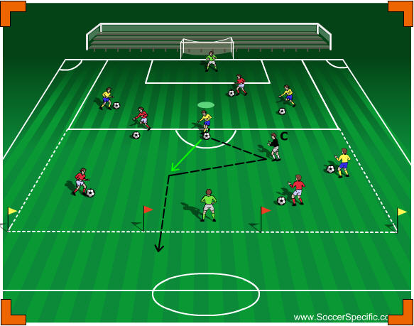 Set up a 55×70 yard field with a regulation size goal at each end. Divide your team into two different colored teams. Every player has a ball and the coach stands anywhere in the middle of the field.